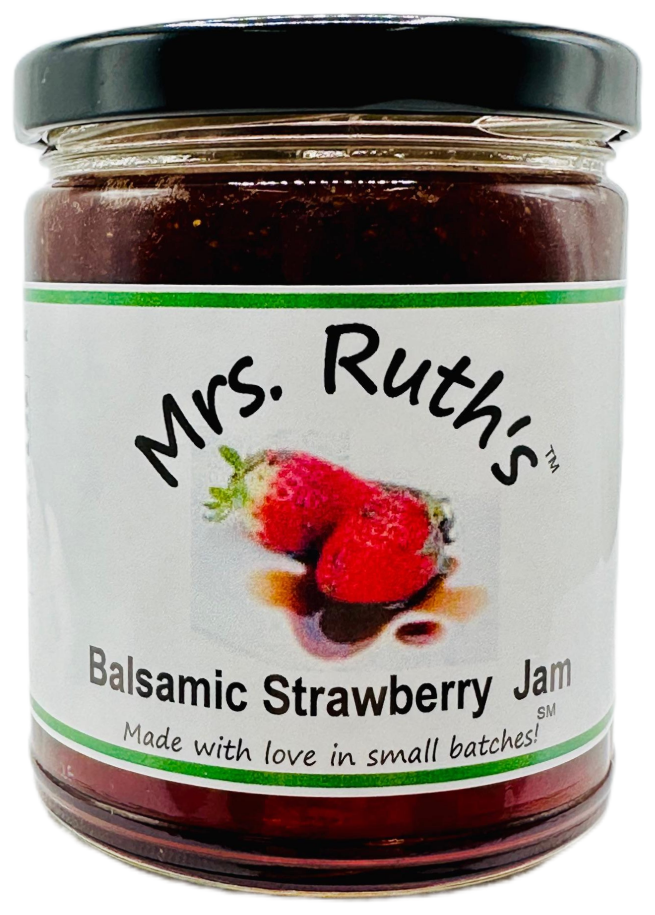 Mrs. Ruth's Balsamic Strawberry Jam - Sweet strawberries highlighted with rich balsamic vinegar – drizzle it over your waffles or spinach salad; top off your grilled chicken or shrimp; perfect with cheese and crackers!